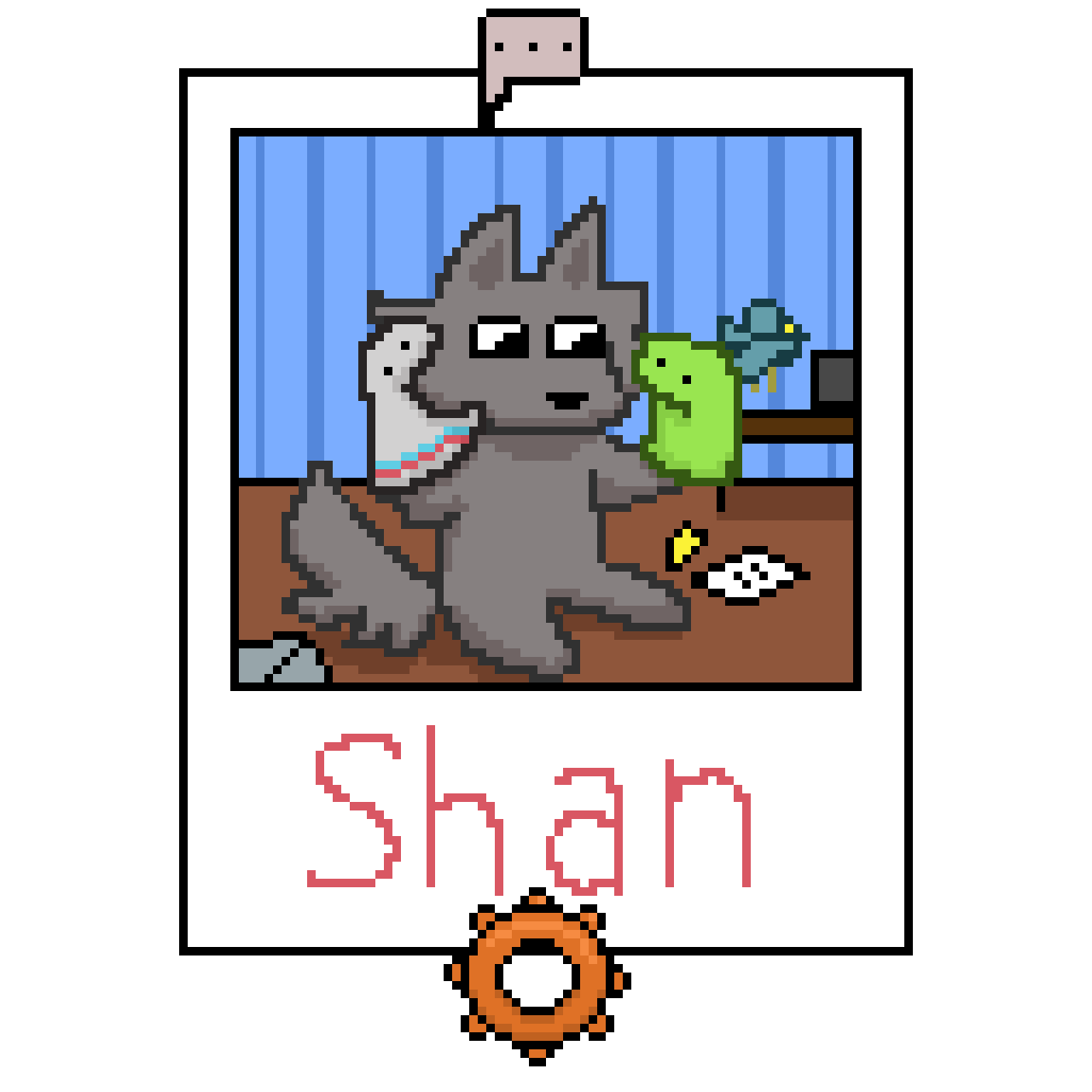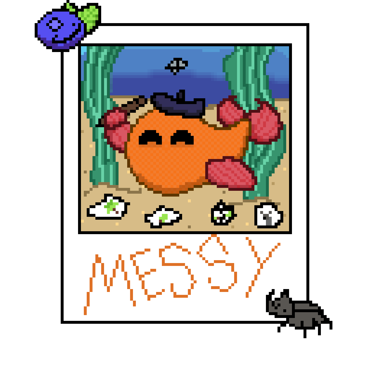 ![]() | This is Messy, Visible Schmo's Lead Artist. His favorite color is orange and his favorite animals are fish. On top of fish, he also really enjoys looking at giraffe weevils and frill sharks. Messy's last name is Fish and he is often seen munching on some vegetables. If your garden's missing some bell peppers, it probably was Messy. | |
